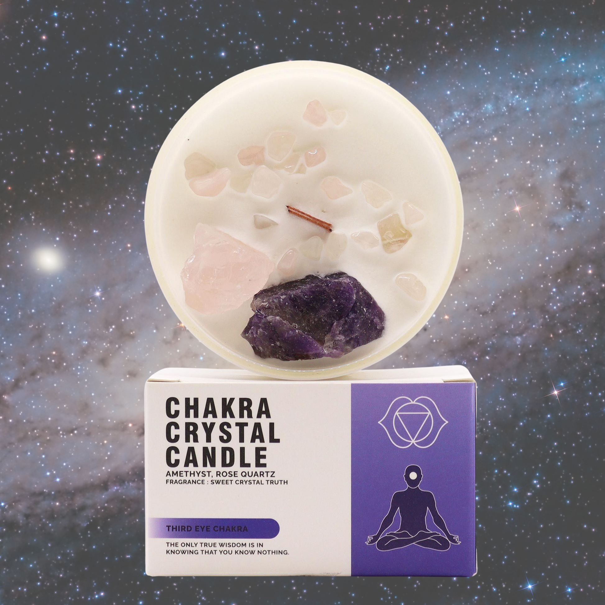 Awaken your inner wisdom and open the gateway to intuition with the Third Eye Chakra Crystal Candle, infused with Amethyst and Rose Quartz gemstones. Crafted to align with the Third Eye Chakra, this candle enhances perception, spiritual awareness, and clarity of thought.